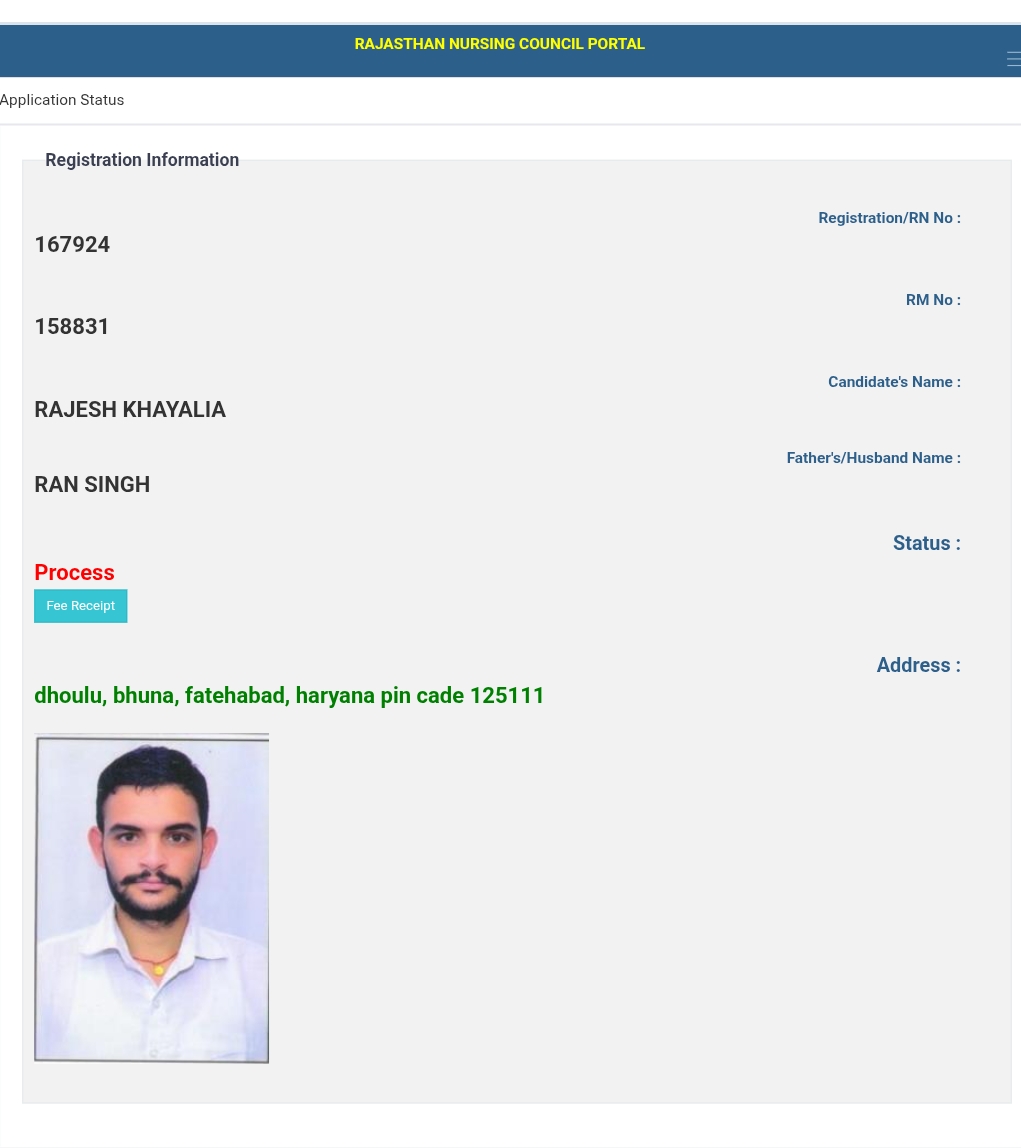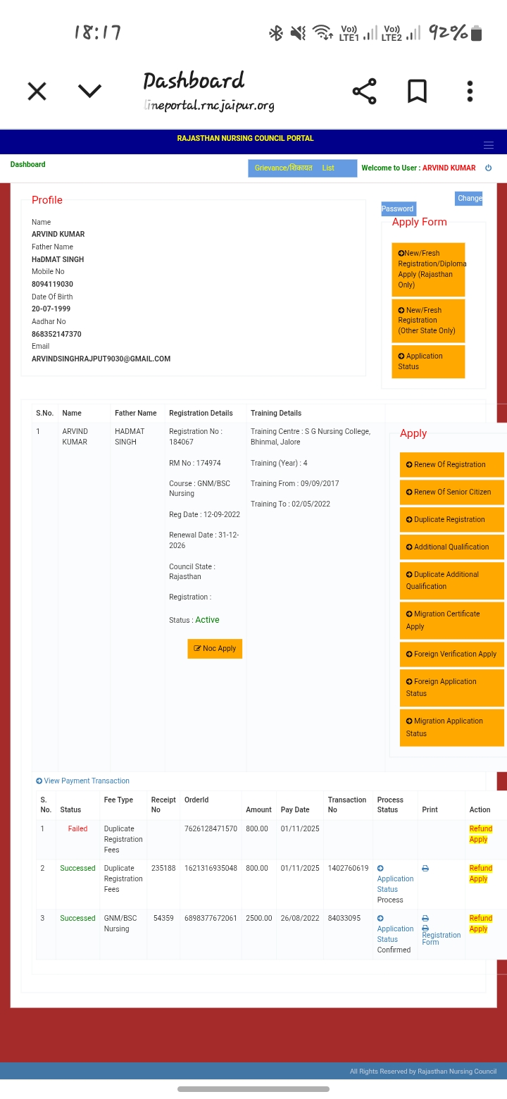 I have applied for my registration/duplicate certificate through rnc online portal my application status has been showings process for a long time, and no further updates or actions is visible on my dashboard ,Kindly provide the current status or remarks regarding my application and inform me if any additional documents or step are required from my side ..my self arvind kumar S/O Hadmat singh ,rN &Rm is 184067,174974 ,transfer ID 1402760619,mob .no 8094119030 |
