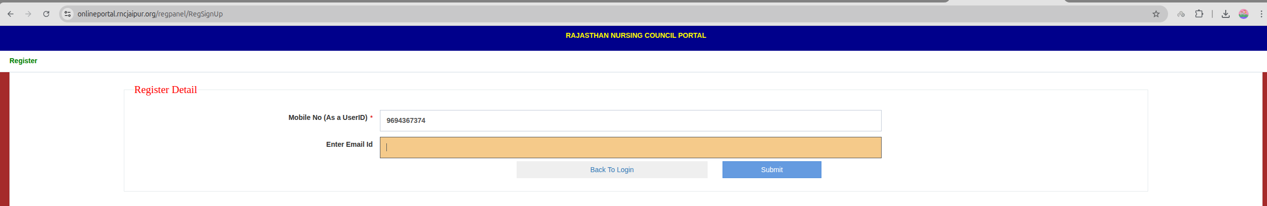 Dear RNC, My self Brijesh Kumar sharma I completed my gnm nursing diploma in 2016 my registration No 106772 I trying to register RNC online portal but I'm not getting any OTP form portal site. My user ID is 7062806681 email id harsorabijesh@gmail.com |