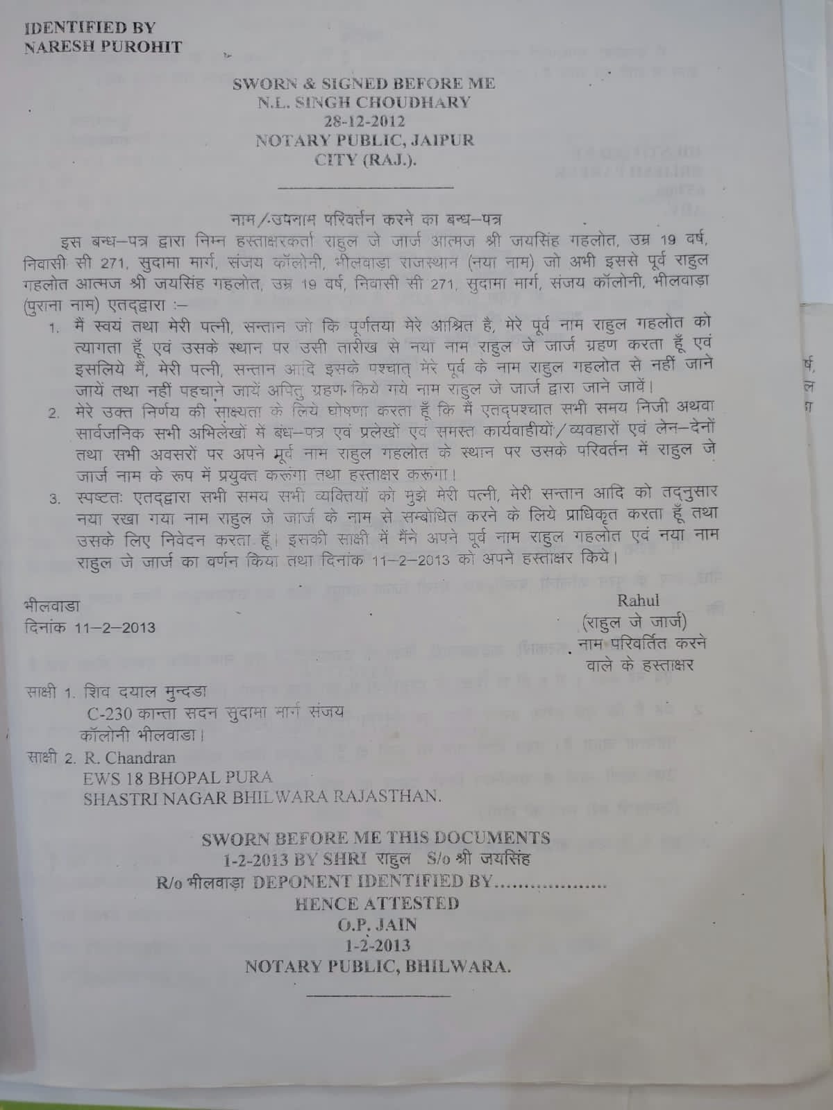 I am writing to bring to your attention a pending issue regarding the correction of my name in your official records. My name was officially changed from Rahul Gehlot to Rahul Jai George in the year 2014, and I had submitted a formal request at that time for the necessary updates to be made in your records. However, I regret to inform you that no action or confirmation has been received regarding the said change to date. As a result, my nursing certificates and nursing license continue to reflect my previous name, Rahul Gehlot, which has caused difficulties in professional verification and documentation. |